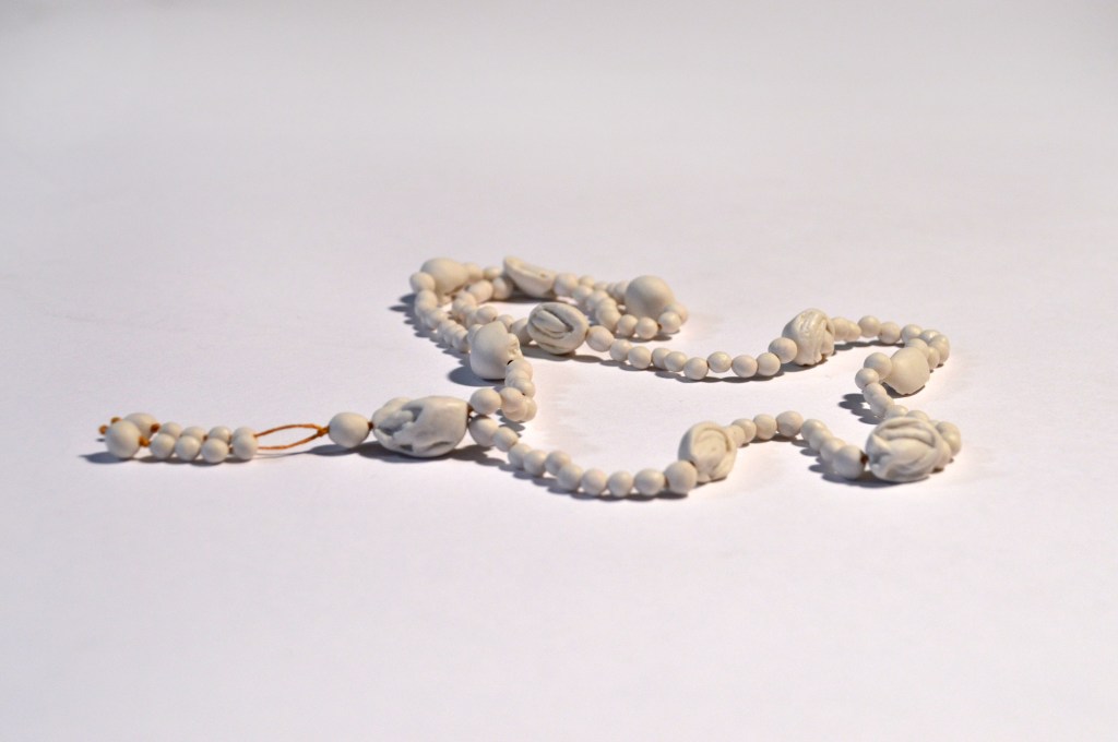 Similaire au chapelet traditionnel, le komboloï est un passe-temps populaire grec réservé aux hommes, ici constitué de moulages de clitoris en argent de 33 femmes différentes. Sacré, objet de méditation et de manipulation, le propriétaire fait tourner l’objet sur ses doigts dans un sens et dans l’autre afin de ramener les petites boules au creux de sa main. Une à une, selon les règles religieuses, ces perles précieuses sont touchées, caressées, comptées, usées par les doigts de leur propriétaire, cette sensation calme l’esprit. Bien que blasphématoire, entre plaisir et fantasme, cet objet retrouve sa fonction originelle d’occupation du corps pour laisser l’esprit méditer.